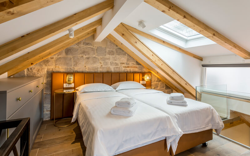 The biggest room among the Miara Rooms which involves 2 floors. Includes 1 big couch which can be transformed into a bed on the lower floor and a big double sized bed on the upper floor. A luxurious bathroom with a lot of space and a table for four